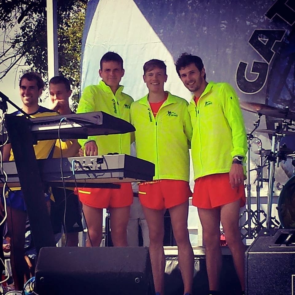 Tyler Pennel (c), Griff Graves (r) and I combined for a second place team score at the Gate River Run / US Road 15k Championships |